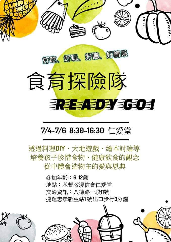 ▶限額:30名,報名請早。▶費用:活動免費,餐費和材料等需自費600元,5/31(含)前完成報名繳費,優待為500元。▶報名小撇步: 仁愛堂官網 線上報名→2019夏令營─食育探險隊→填寫完成→至仁愛堂繳費→報名完成 ▶如有疑問: 請於上班時間,星期一至星期六早上九點至十二點,下午一點半至五點半星期日下午一點至四點洽仁愛堂辦公室02-2397-1282#22洪小姐